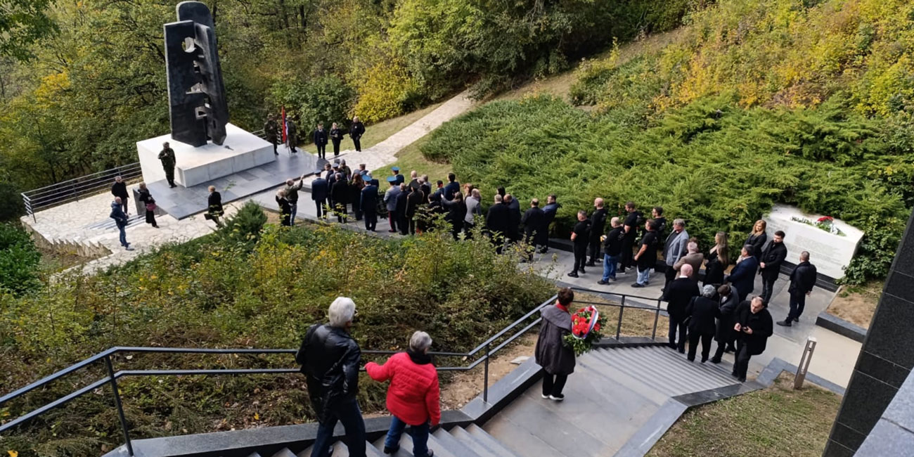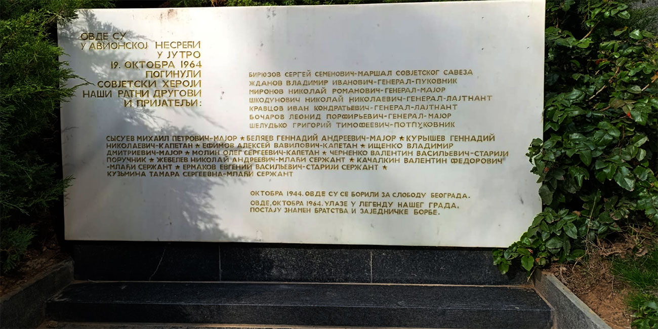 «Здесь в авиакатастрофе утром 19 октября 1964 года погибли советские герои, наши боевые друзья и товарищи. Здесь в октябре 1944 года они боролись за свободу Белграда. Здесь же в октябре 1964 года они стали частью легендарной истории нашего города, символом братства и общей борьбы».